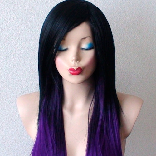 Black Purple Ombre Wig 28 Straight Layered Hair Side Etsy